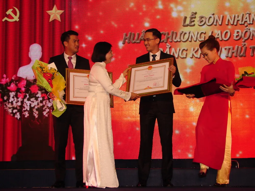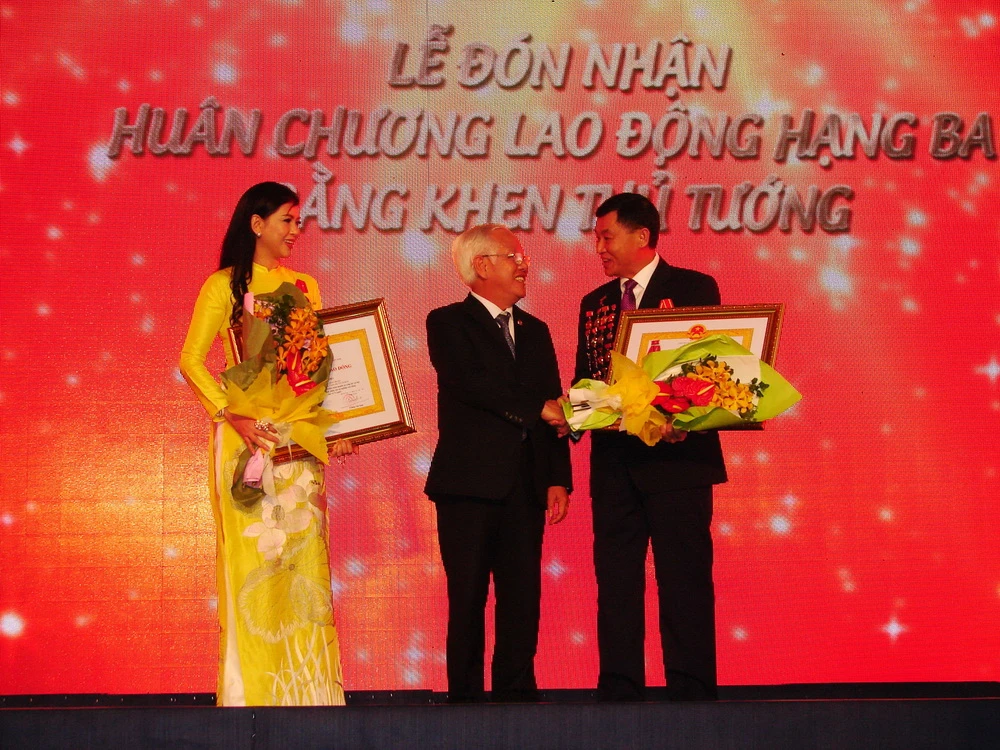 Bà Thủy Tiên và ông Johnathan Hạnh Nguyễn (đại diện cho IPP) cùng đón nhận huận chươnglao động do Chủ tịch UBND TP Lê Hoàng Quân thay mặt trao tặng. Ảnh: T.MẬN