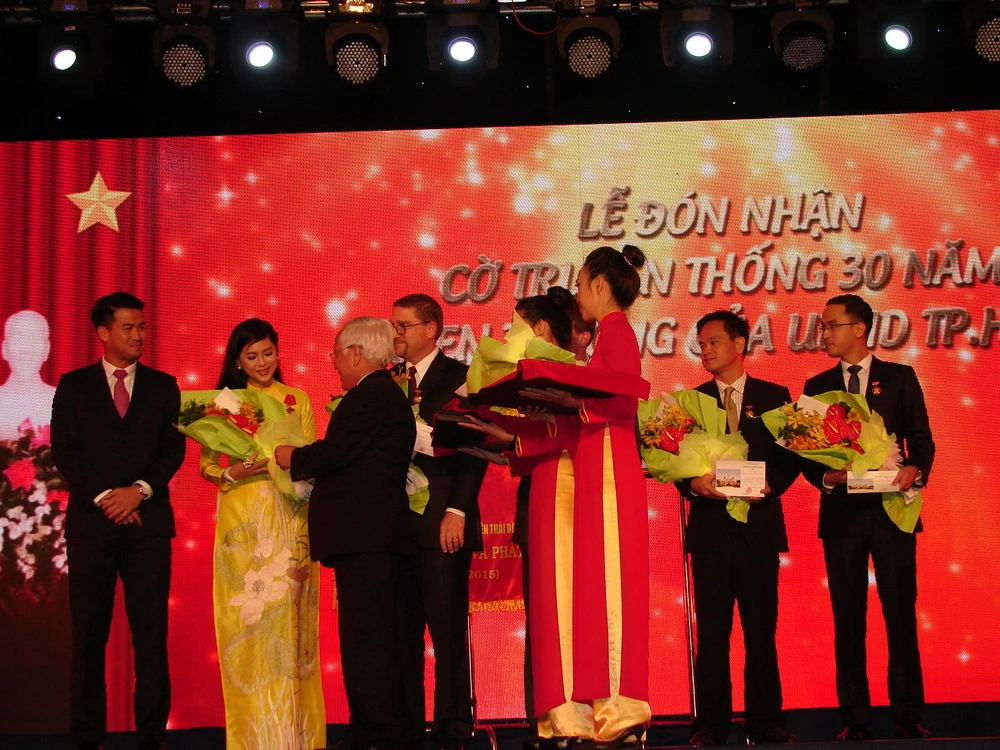 Bà Thủy Tiên - vợ ông Johnathan Hạnh Nguyễn -cùng tập thể IPP đón nhận bằng khen của UBND TP. Ảnh: T.MẬN