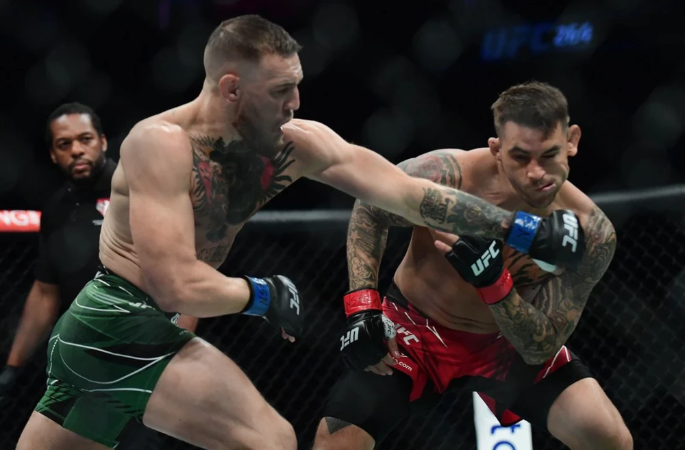 McGregor tung đòn trong trận đấu Dustin Poirier hồi tháng 7-2021. ẢNH: REUTERS