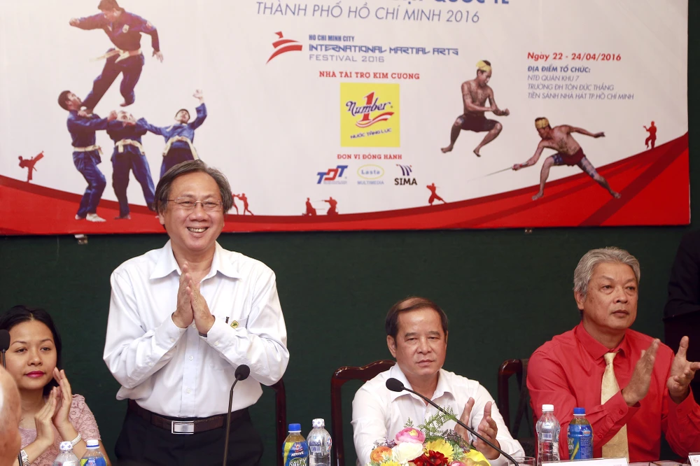 Phó Giám đốc Sở VH-TT TP.HCM Mai Bá Hùng (đứng) tin tưởng Liên hoan Võ thuật quốc tế TP.HCM thành công tốt đẹp.