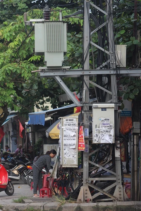 Ngay tại ngã 3 Duy Tân - Lương Văn Can, một trạm biến áp nằm lọt thỏm giữa nhà dân với hàng chùm dây chằng chịt trên đầu.