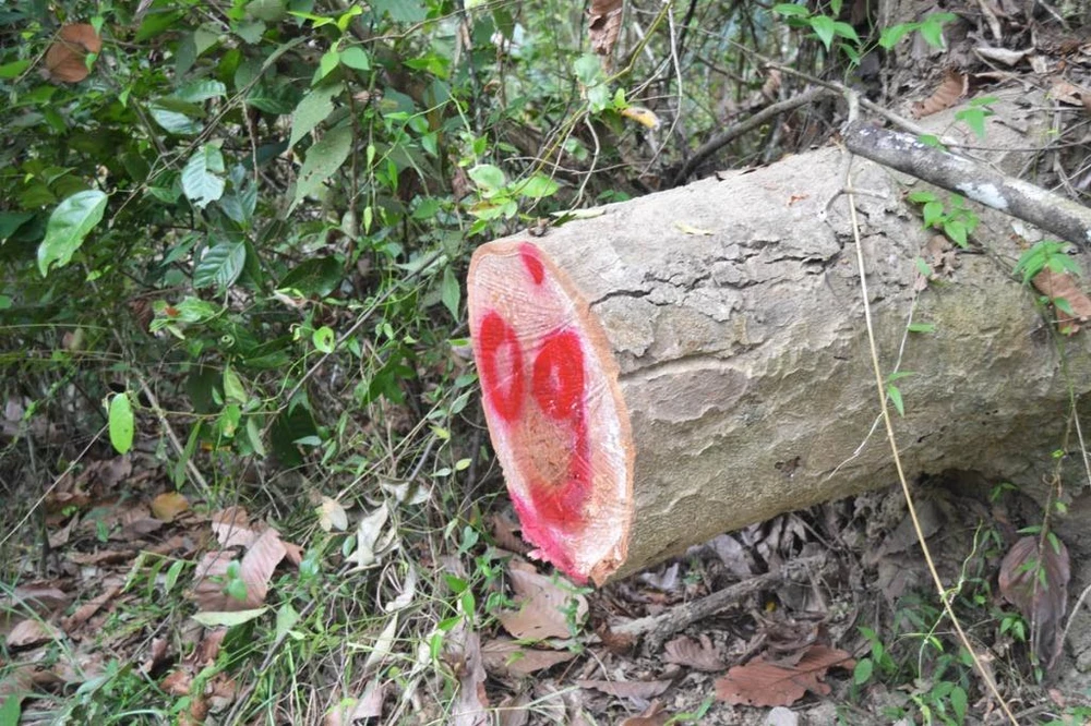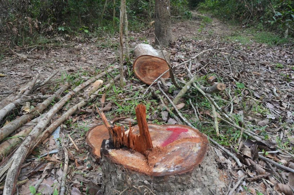 Nhiều gốc cây có đường kính lớn đã bị triệt hạ, đã lấy gỗ đưa đi. Ảnh: NGỌC ANH