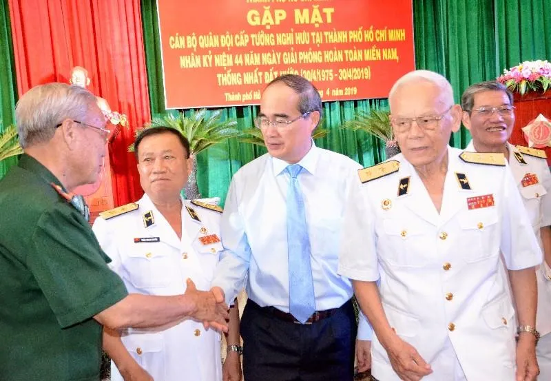 Bí thư Thành ủy TP.HCM Nguyễn Thiện Nhân gặp mặt các tướng lĩnh quân đội hôm 26-4. Ảnh: PHƯƠNG THÙY