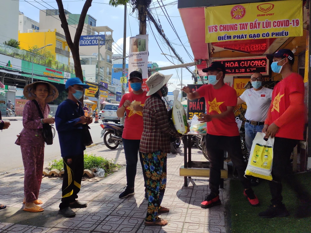 Anh Trần Hữu Nghĩa, anh Phạm Tiến từ sáng sớm đã hô hào anh chị em trong hội VFS phát phiếu nhận gạo đến tận tay những người đang có hoàn cảnh khó khăn mùa dịch. Sự lan tỏa yêu thương của VFS thật cảm động khi biết có một số anh em nhiệt tình tham gia với tinh thần “là rách ít đùm lá rách nhiều”.