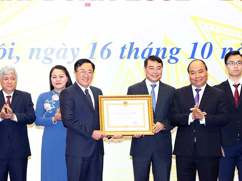 Thủ tướng Nguyễn Xuân Phúc trao tặng huân chương Lao động hạng Nhất của Chủ tịch nước cho Ngân hàng Chính sách xã hội. Ảnh: TTXVN