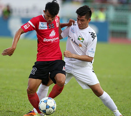 ĐT Long An (trái) thua SL Nghệ An. Ảnh: XUÂN HUY