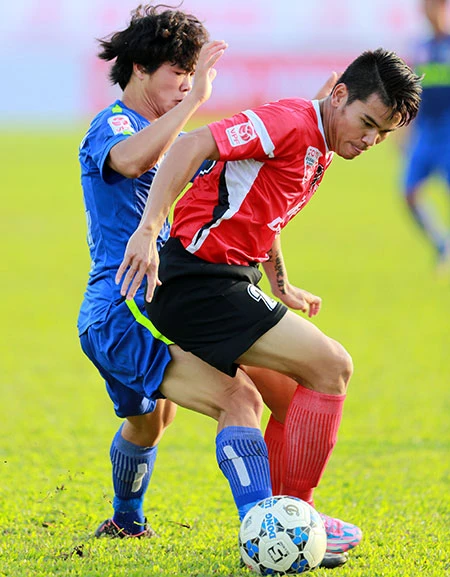 Sức trẻ của Công Phượng lép vế trước kinh nghiệm của đàn anh Quang Thanh. Ảnh: XUÂN HUY