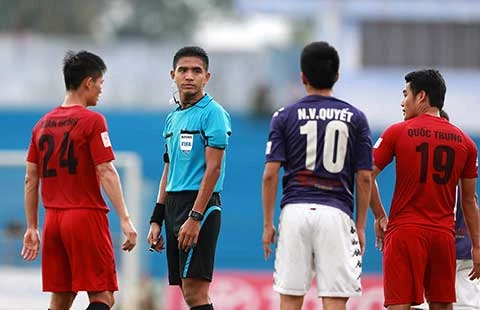Cái uy của trọng tài ngoại người Malaysia, ông Nasaruddin, khiến các cầu thủ tâm phục khẩu phục. Ảnh: QUANG THẮNG