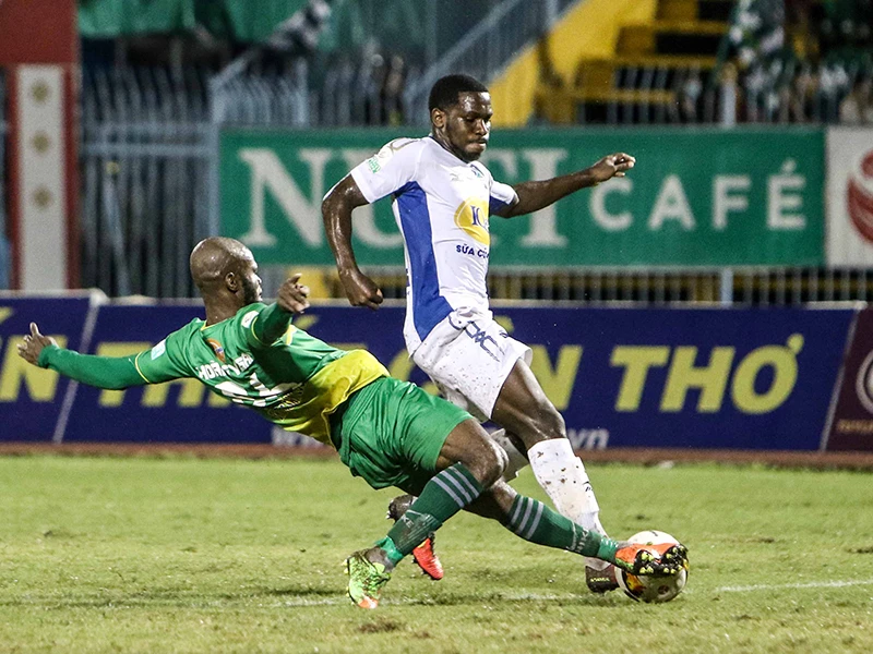 Cần Thơ (áo sậm), đội bóng từng được liệt vào danh sách khó khăn nhưng giá mua cầu thủ ngoại lại trên trời. Ảnh: HUY PHẠM