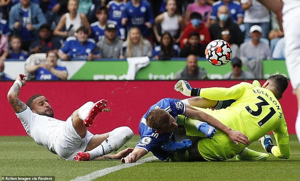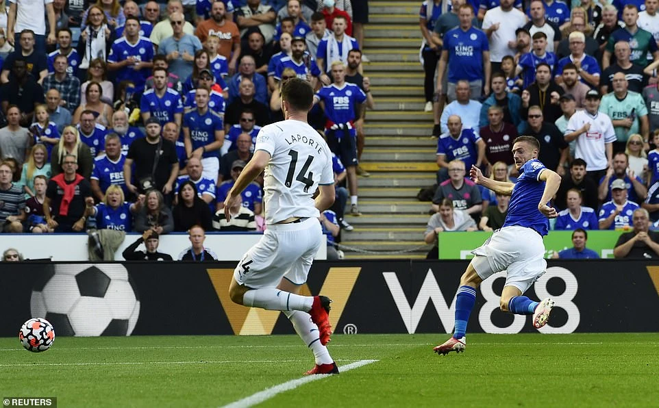 Vardy làm rung lưới "Man Xanh", nhưng bàn thắng không được công nhận cho "Bầy Cáo" vì lỗi việt vị. Ảnh: Reuters.