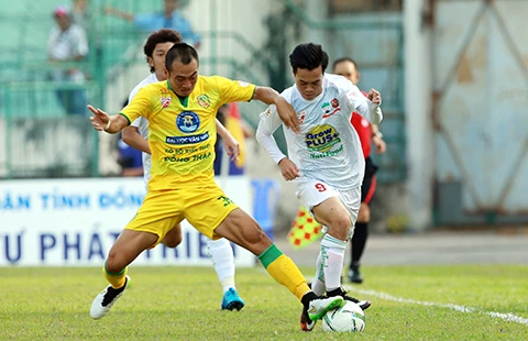 Đồng Tháp thắng HA Gia Lai 2-1 trong buổi chiều mà hàng thủ hai bên đều lập bập để thua bất ngờ. Ảnh: XUÂN HUY