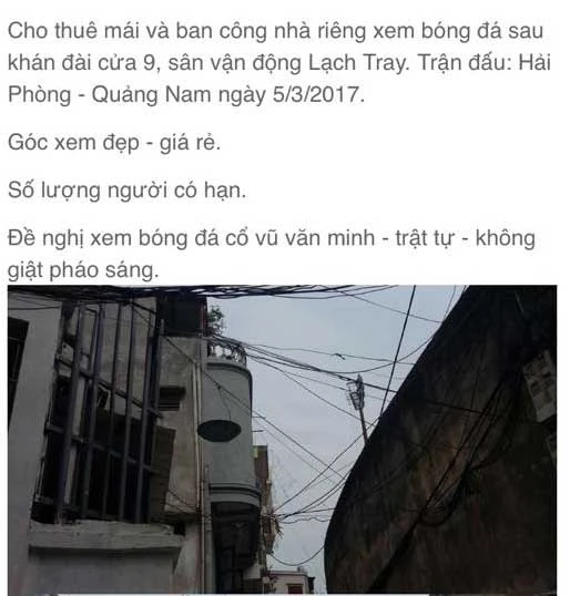 Nhân cơ hội này, những nhà cao tầng quanh sân Lạch Tray đã phát đi thông báo cho thuê sân thượng để các “thượng đế” xem trận đấu từ bên ngoài sân.