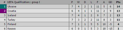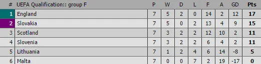Ở bảng F, Anh sau trận thắng Mata 4-0 đã tiếp tục đứng đầu bảng với 17 điểm, tuy nhiên họ cách những đội phía sau như Slovakia (15 điểm), Scotland (11 điểm) và Slovania (11 điểm) với khoảng cách không lớn.