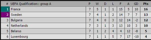 Ở bảng A, Hà Lan đã thất thủ 0-4 trên sân Pháp và tụt xuống vị trí thứ tư trên bảng xếp hạng. Pháp (16 điểm) với thực lực vượt trội gần như chắc suất đến Nga, dù họ chỉ hơn đội nhì bảng có 3 điểm. Ba đội Thụy Điển (13 điểm), Bulgaria (12 điểm) và Hà Lan (10 điểm) sẽ cạnh tranh nhau vị trí nhì bảng nhằm hy vọng có suất dự play-off.