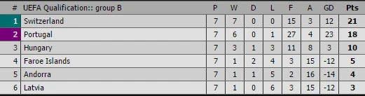 Trong khi đó, bảng B, Bồ Đào Nha dù thắng Đảo Faroe 5-1 nhưng vẫn xếp sau Thụy Sĩ với khoảng cách đúng một trận thắng. Chiếc vé trực tiếp tham dự World Cup 2018 sẽ được quyết định ở lượt cuối cùng khi Bồ Đào Nha sẽ gặp Thụy Sĩ trên sân nhà.
