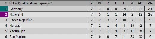 Trong những ông lớn còn lại thì Đức tỏ ra ổn định nhất khi toàn thắng cả bảy trận đấu, mới đây nhất họ thắng Czech 2-1. Hiện Đức hơn đội nhì bảng Ireland đến 5 điểm và hơn đội thứ ba Czech đến 12 điểm, điều này đồng nghĩa Đức chắc chắn kết thúc vòng loại với một trong hai vị trí đầu hoặc nhì bảng.