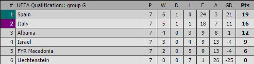Ở bảng G, cuộc cạnh tranh chiếc vé trực tiếp đến Nga giữa Tây Ban Nha và Ý đã gần như ngã ngũ khi Ý thất thủ 0-3 tại Madrid trước Tây Ban Nha. Hiện Ý kém Tây Ban Nha 3 điểm (19 so với 16) nhưng hơn đội thứ ba Albania đến 4 điểm. Tây Ban Nha xem như đã có vé thẳng đến Nga do hơn điểm cũng như hiệu số bàn thắng bại tốt hơn nhiều so với Ý. Chiếc vé dự play-off cũng khó thoát khỏi tay Ý.