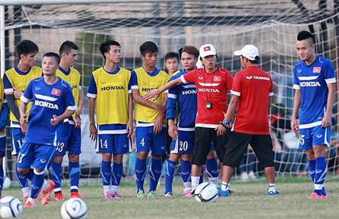 HLV Miura đang tập cho các học trò những miếng đánh để đối đầu với Iraq. Ảnh: QUANG THẮNG