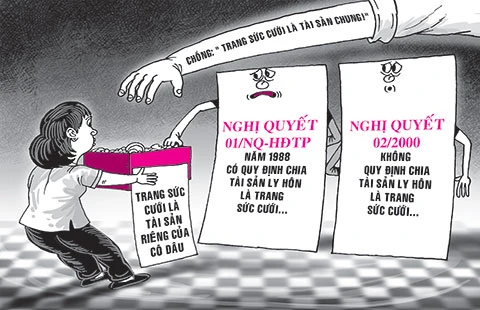 | Tùy vào cho riêng hay cho chung Trước đây, Nghị quyết 01/NQ-HĐTP năm 1988 của Hội đồng Thẩm phán TAND Tối cao đã hướng dẫn áp dụng một số quy định của Luật Hôn nhân và Gia đình. Theo đó, đối với vụ án ly hôn mà vợ chồng có tranh chấp về tài sản là nữ trang ngày cưới được pháp luật quy định như sau: Đồ trang sức mà người vợ hoặc người chồng được cha mẹ vợ hoặc chồng tặng, cho riêng trong ngày cưới là tài sản riêng. Nhưng nếu những thứ đó được cho chung cả hai người với tính chất là tạo dựng cho vợ chồng một số vốn thì coi là tài sản chung. Khi chia tài sản chung, những trang sức có giá trị không lớn so với tài sản chung thì chia cho người đang sử dụng. Sau này, Nghị quyết 02/2000 ra đời thay thế Nghị quyết 01 đã không còn quy định vấn đề chia tài sản ly hôn là trang sức nữa. Trên thực tế, những nữ trang như đôi bông cưới, dây chuyền, vòng vàng được tính là đồ dạm hỏi thì thường được coi là nữ trang cho riêng cô dâu nên vẫn có thể xem là tài sản riêng. Còn đối với vàng khâu, tuy là đeo cho cô dâu nhưng nếu người cho xác định vào thời điểm cho là cho hai vợ chồng thì nó vẫn là tài sản chung. Một thẩm phán Tòa Dân sự TAND TP.HCM |