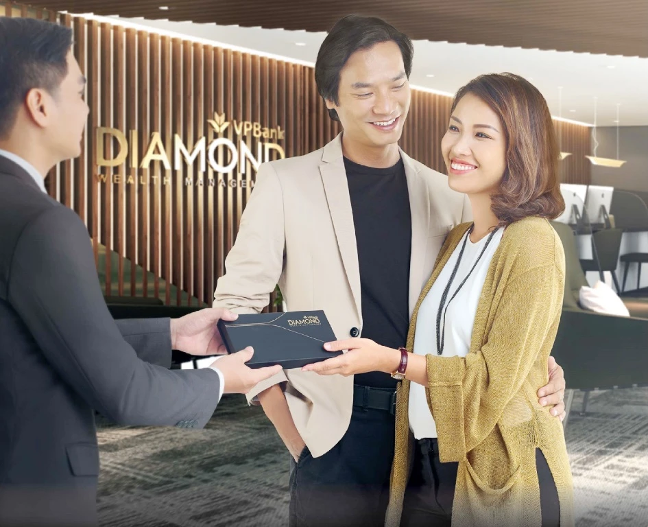 Các khách hàng được hưởng dịch vụ VPBank Diamond sẽ được phục vụ bởi những chuyên viên quan hệ khách hàng được tuyển chọn và đào tạo kỹ lưỡng, được tiếp cận dịch vụ ngân hàng từ nhiều kênh khác nhau, như Door Step Banking (dịch vụ tận nơi); phòng giao dịch riêng biệt (không phải chờ đợi); đường dây nóng riêng (tự động kết nối lại sau 1 giờ với cuộc gọi nhỡ); Kênh điện tử riêng biệt (cả với website và ứng dụng di động)… Và đặc biệt, khách siêu VIP cũng VPBank còn được sử dụng phòng chờ dành riêng tại sân bay Nội Bài, mang tên VPBank Diamond Elite, mỗi khi cần di chuyển bằng máy bay.