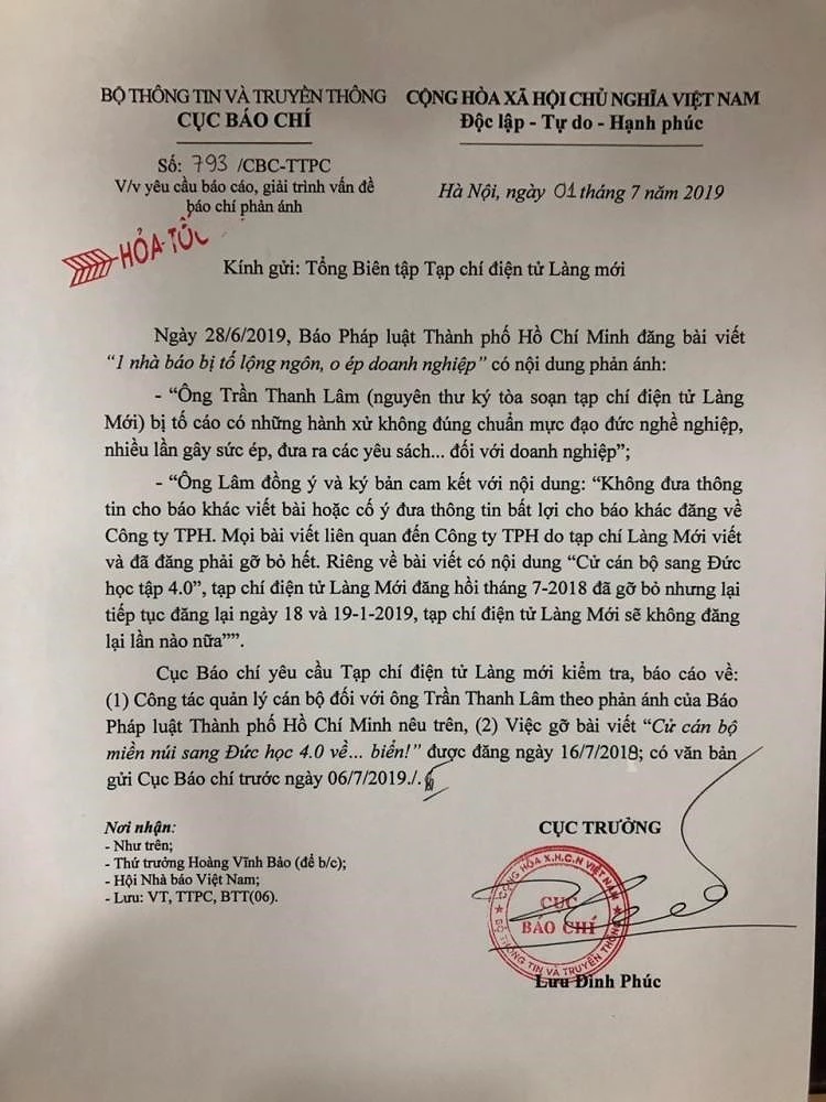 Cùng với đó, Cục Báo chí (Bộ TT&TT) ngày 1-7 đã có văn bản gửi Tổng Biên tập Tạp chí điện tử Làng mới về việc yêu cầu báo cáo, giải trình vấn đề báo chí phản ánh.
