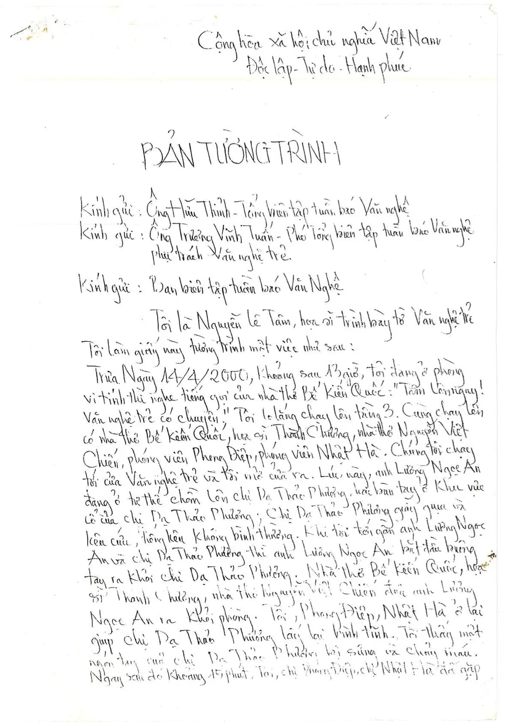Một bản tường trình được cho là liên quan đến thư ngỏ có nội dung tố cáo bị cưỡng bức tình dục được đăng tải trên mạng xã hội .