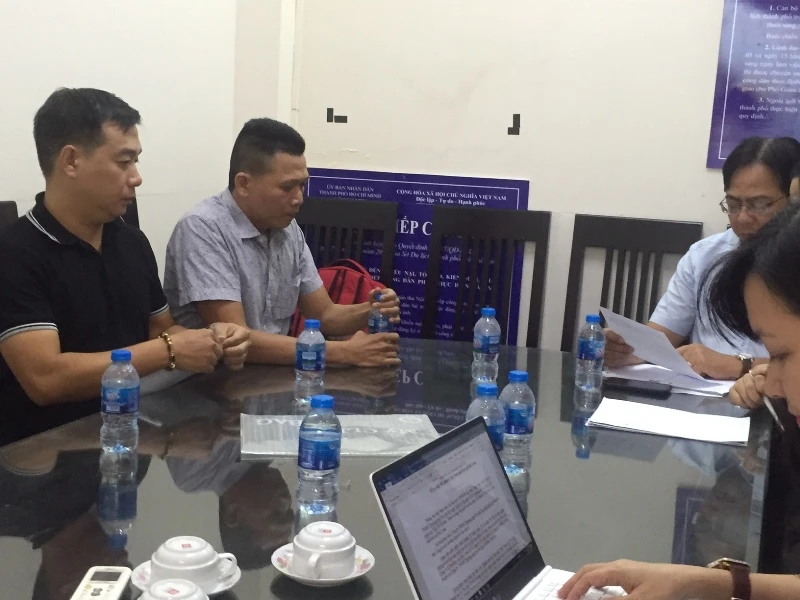 Ông Phan Ngọc Hạnh, Giám đốc Công ty Du lịch Kỳ Nghỉ Quốc Tế (áo đen, bên trái), đang trình bày sự việc với Sở Du lịch TP.HCM chiều 26-12.