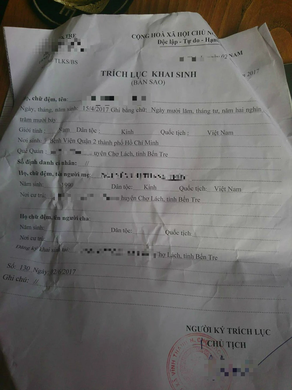 Giấy khai sinh của bé H. do anh A. đang giữ. Ảnh: HOÀNG LAN