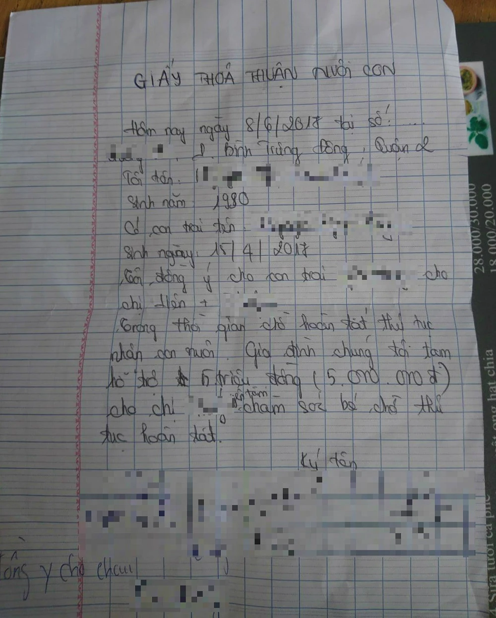 Giấy đồng ý cho con của chị T. và hỗ trợ 5 triệu đồng. Ảnh: HOÀNG LAN