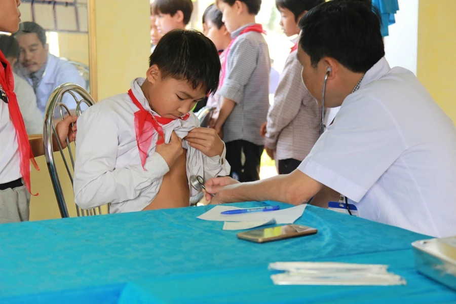 Bác sĩ khám sàng lọc cho các em học sinh ở xã Hạnh Dịch. Ảnh: ĐL
