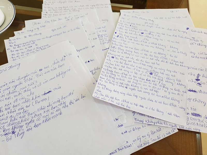 Một câu hỏi khác: “Trước N. có bao nhiêu bạn bị tát?”. Nhiều em trả lời là bảy bạn đã bị tát, lớp trưởng NTN khi trả lời các nhà báo là 10 bạn đã bị tát, còn N. trong clip nói chuyện với chúng tôi trước đó cũng khẳng định đã có 10 bạn bị phạt tát do cô Thủy phát động. Tuy nhiên, trong lời khai này, cả lớp trưởng và N. đều trả lời 0. Một số HS cho hay (các em đề nghị chúng tôi giấu tên), các em bị cấm nói cô đã phạt tát bao nhiêu bạn, một số bạn vì bức xúc nên viết vào, một số bạn vì sợ mà viết thành 0 bạn. HS còn phản ánh nhà trường không cho các em nói về hình phạt tát đã diễn ra với N. cùng với các bạn trước đó. Nếu phát hiện ai nói sẽ có hình thức tương xứng vì đó là danh dự nhà trường.