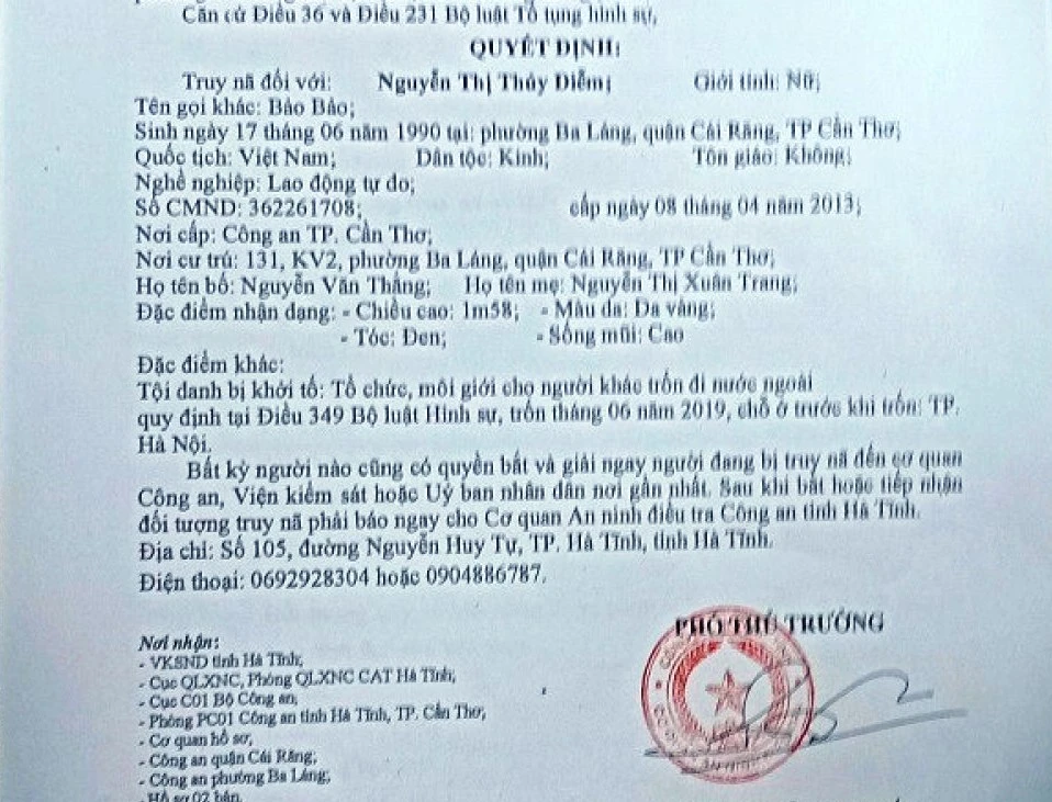 Ngày 21-2, Công an tỉnh Hà Tĩnh cho biết đã ra quyết định truy nã đối với Nguyễn Thị Thúy Diễm (tức Bảo Bảo, 30 tuổi, quê trú tại phường Ba Láng, quận Cái Răng, TP Cần Thơ, lấy chồng Trung Quốc). Diễm trước đó bị khởi tố về tội tổ chức, môi giới cho người khác trốn đi nước ngoài.