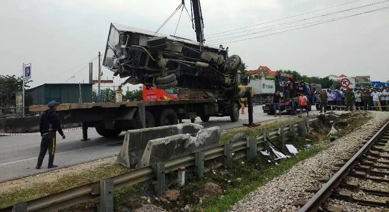 Lực lượng chức năng cẩu chiếc xe tải khỏi hiện trường, giải phóng ách tắc quốc lộ 1A và đường sắt Bắc-Nam.
