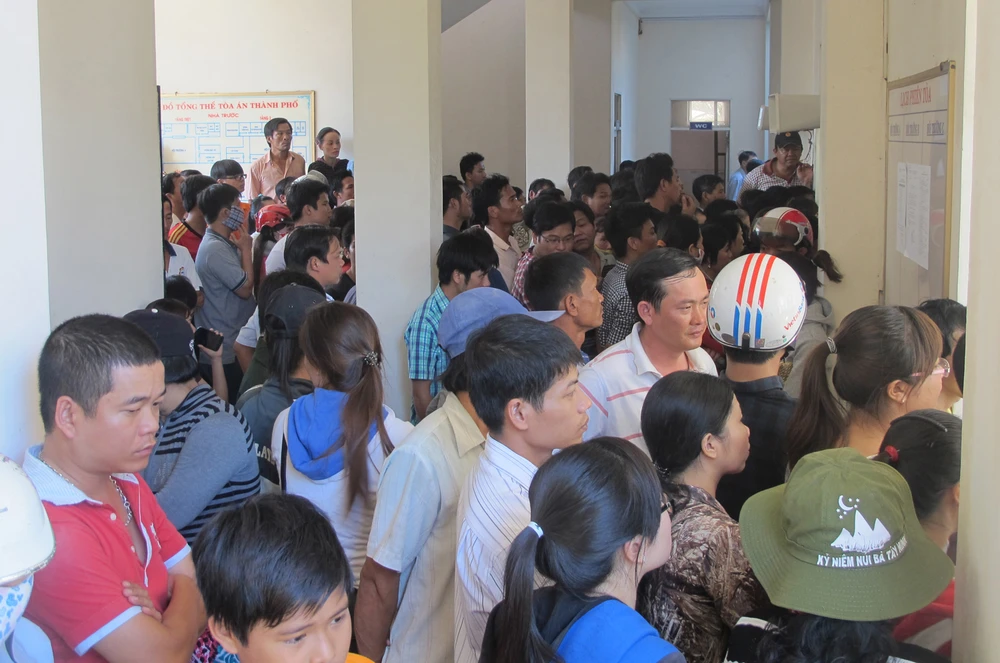 Bên ngoài hành lang phòng xử cũng chật cứng . Ảnh: T.Lộc