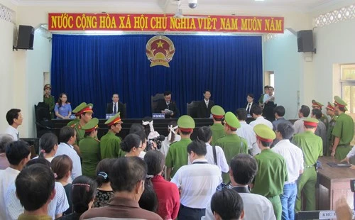 Rất đông các cán bộ công an có mặt để giữ trật tự phiên tòa. Phóng viên báo chí bị ngăn cản, không cho chụp ảnh các bị cáo.