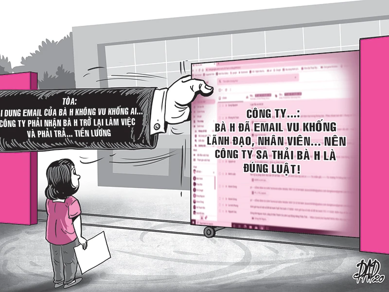 HĐXX TAND quận Thủ Đức nhận định công ty đưa ra các email làm chứng cứ chứng minh bà H. vu khống. Tuy nhiên, những chứng cứ này không chứng minh được hành vi của bà H. là vu khống ai, cụ thể nội dung vu khống như thế nào. Việc công ty dựa vào các nội dung có trong các email này làm căn cứ sa thải là không đúng quy định của pháp luật về lao động.