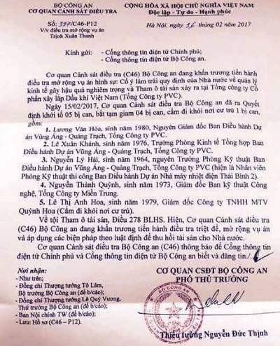 Trước đó, ngày 15-2-2017, Cơ quan CSĐT Bộ Công an đã ra quyết định khởi tố năm bị can về tội tham ô tài sản theo Điều 278 BLHS (ảnh).