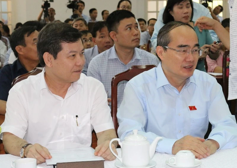 Bí thư Thành ủy TP.HCM Nguyễn Thiện Nhân và Viện trưởng VKSND Tối cao Lê Minh Trí tại buổi tiếp xúc. Ảnh: TÁ LÂM