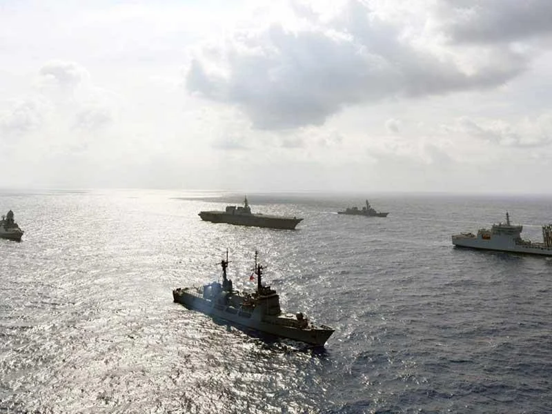 Tàu chiến Mỹ, Philippines, Ấn Độ và Nhật Bản ở biển Đông khi đang tham gia tập trận chung bốn nước hồi tháng 5-2019. Ảnh: AP