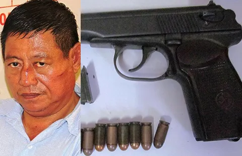 Nghi phạm Lay Bun Thy tại cơ quan điều tra và khẩu K59 nghi phạm sử dụng khi gây án. (Ảnh do công an cung cấp)