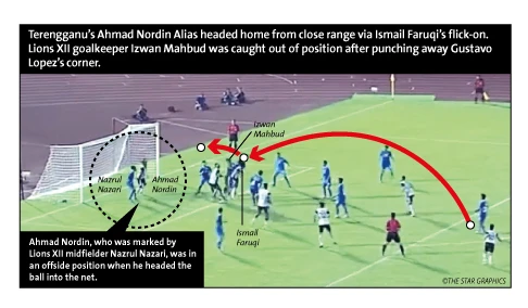 Hôm qua (18-5), Hội đồng trọng tài (HĐTT) Malaysia tiến hành mổ băng phân tích và kết luận trọng tài đã đúng khi không công nhận bàn thắng cho Terengganu (xem hình đồ họa phía trên). Phút 89, Terengganu được hưởng phả sút phạt từ ngoài vùng cấm. Một cầu thủ bấm bóng vào khu vực bên trong vạch 5m50. Thủ môn Izwan Mahbud của LionsXII lao ra nhưng Nordin Alias đã bật nhảy cao hơn đội đầu vào khung thành. Tuy nhiên phía dưới đó có một đồng đội của Alias là Ahmad đang đứng ở khu vực việt vị (xem hình đồ họa, cầu thủ áo trắng ở thế việt vị). Khi bóng vào lưới, trọng tài chính Amirul Izwan không công nhận bàn thắng. Vì tình huống này cầu thủ việt vị đã có tầm ảnh hưởng vào việc quả bóng chui vào lưới vì anh ta đã đứng che một cầu thủ LionsXII không cho cầu thủ của LionsXII vào can thiệp bóng…nên trọng tài không công nhận bàn thắng. Nếu tình huống này Ahmad (cầu thủ trong thế việt vị) không gián tiếp dính vào tình huống (dù việt vị) thì bàn thắng vẫn được công nhận.