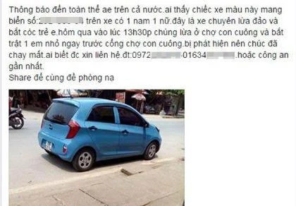 Từ chiều 22-4, trên trang Facebook Nghệ An News đăng tải hình ảnh xe ô tô con màu xanh với thông tin: "Thông báo đến toàn thể anh em trên cả nước, ai thấy chiếc xe màu này mang biển số 29D-XXX.54, trên xe có 1 nam 1 nữ. Đây là xe chuyên lừa đảo và bắt cóc trẻ em. Hôm qua vào lúc 13h30 chúng lừa ở chợ Con Cuông và bắt cóc hụt một em nhỏ ngay trước cổng chợ Con Cuông. Bị phát hiện nên chúng đã chạy mất...". Thông tin trên được hơn 50.000 lượt thích và hơn 10.000 lượt chia sẻ.