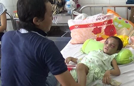 Anh Tố đang chăm sóc bé Ngân tại bệnh viện. Ảnh: VĂN NGỌC