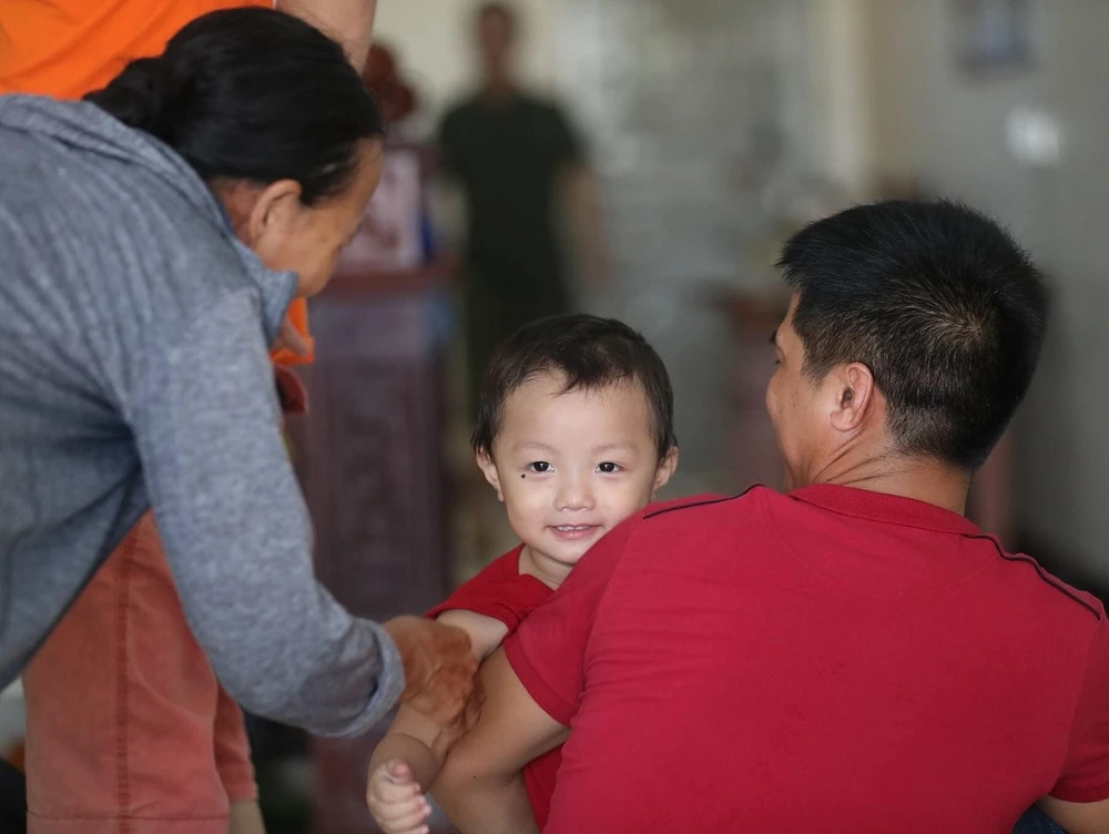 Bé trai vui cười bên người thân sau khi trải qua một biến cố lớn trong cuộc đời. Ảnh: UYÊN TRANG