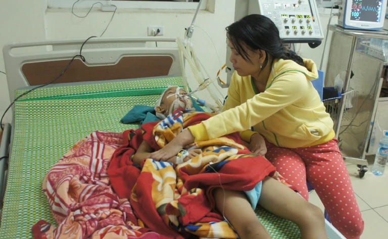 Bé Nguyễn Ngọc Chiến (10 tuổi) đang được cấp cứu, điều trị tại BV Sản-Nhi Nghệ An. Ảnh: Đắc Lam