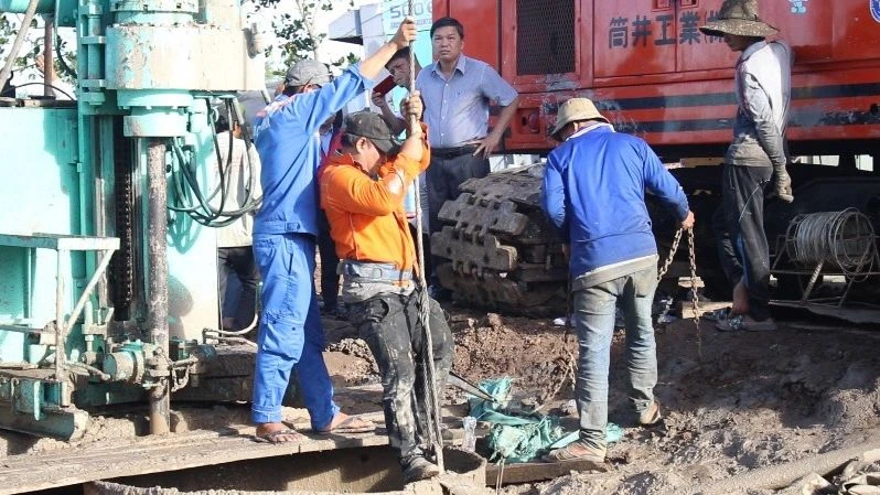 Sau đó, đội cứu hộ đã tiến hành đào đất trong lòng hố kết hợp với bơm dung dịch bentonite phạm vi phía dưới khung vây ván thép.