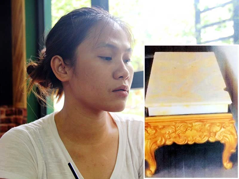 Bị cáo Lê Thị Trang và chiếc bàn mặt đá mà bị hại dán keo sử dụng bình thường sau khi CQĐT trả lại (ảnh nhỏ). Ảnh: ĐT