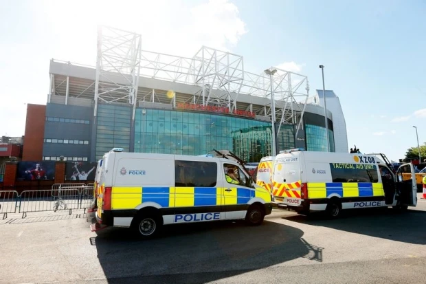 Xe cảnh sát túc trực bên ngoài sân Old Trafford để ứng phó.