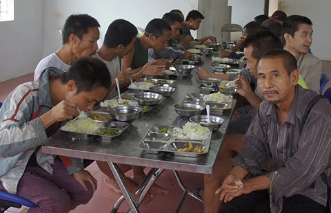 Bữa ăn trưa 7-11 của người bị bệnh tâm thần tại Trung tâm BTXH tỉnh Nghệ An đầy đủ hơn trước đây. Ảnh: ĐẮC LAM