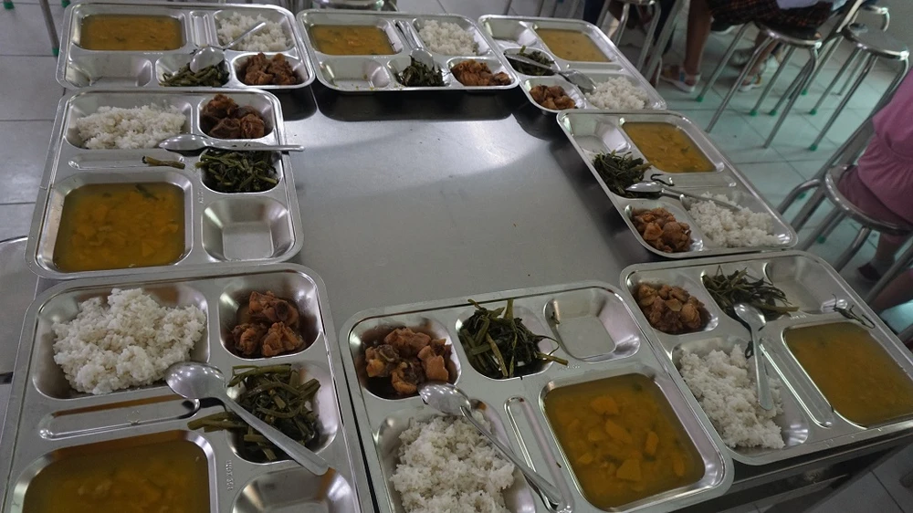 Bữa ăn bán trú của học sinh trưa 3-11 đã có sự cải thiện, được đựng trong khay inox, có chia ngăn. Ảnh: NGUYỄN QUYÊN